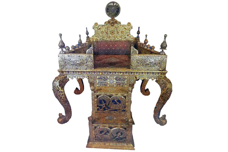 هذا العرش البهي الذي يتألف من الخشب، الذهب والأحجار المتلألئة، يأسر بأنواره الباهرة أنظار كل من يراه. صُنع هذا العرش بأمر فتحعلي شاه القاجاري ليحلّ محل نسخة فُقدت بعد وفاة نادر شاه. إن رمز الشمس الذي يعلو العرش يُجسد إشعاعًا أبديًا على ملك إيران. وبعد زواج فتحعلي شاه من تاجالدوله، التي كان اسمها يعني «الطاووس المتوَّج»، اشتهر هذا العرش باسم «عرش الطاووس».