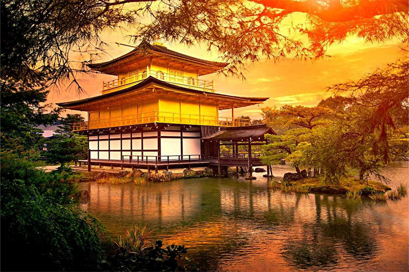 Kinkaku-ji مشهور به معبد طلایی است که با ورقههای طلای درخشان پوشیده شده است. انعکاس این بنای طلایی در آب حوض مقابلش، یکی از بهیادماندنیترین مناظر ژاپن را خلق میکند. در گذشته این مکان بعنوان ویلای جنگی «آشیکاگا یوشیمیتسو» (Ashikaga Yoshimitsu) بود. از اینرو بنا به درخواست خودش بعد از مرگ وی در سال ۱۴۰۸ ، این مکان تبدیل به یک معبد ذن شد.